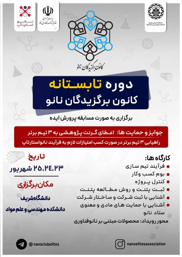 دوره تابستانه کانون برگزیدگان نانو با همکاری ستاد ویژه توسعه فناوری نانو و نانو استارت آپ و به میزبانی دانشکده مهندسی و علم مواد دانشگاه صنعتی شریف در تاریخ 23-25 شهریور ماه 1401 برگزار می گردد.
