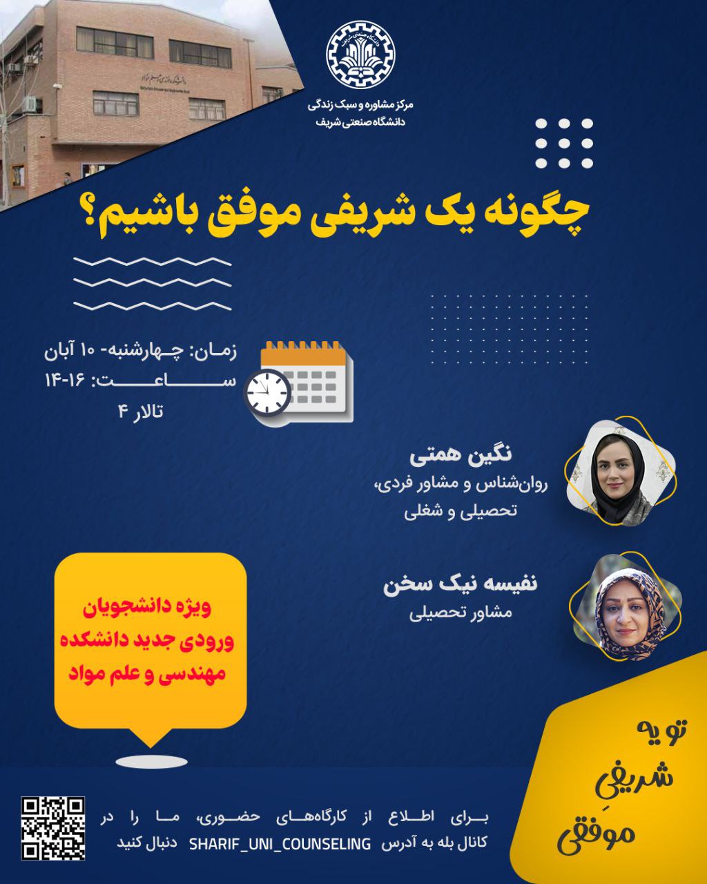 برگزاری کارگاه "چگونه یک شریفی موفق باشیم؟" با همکاری مرکز مشاوره دانشگاه صنعتی شریف ویژه دانشجویان ورودی دانشکده مهندسی و علم مواد