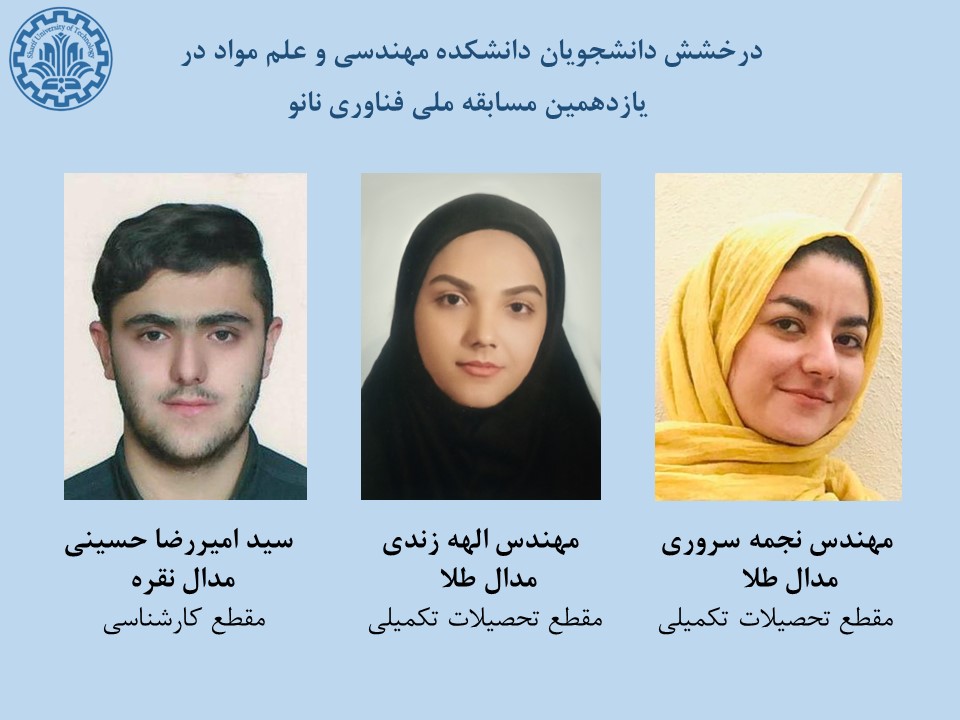 دانشجویان دانشکده مهندسی و علم مواد دانشگاه صنعتی شریف موفق شدند دو مدال طلا و یک مدال نقره را در یازدهمین مسابقه ملی فناوری نانو به ارمغان بیاورند. اسامی دانشجویان به شرح ذیل است: