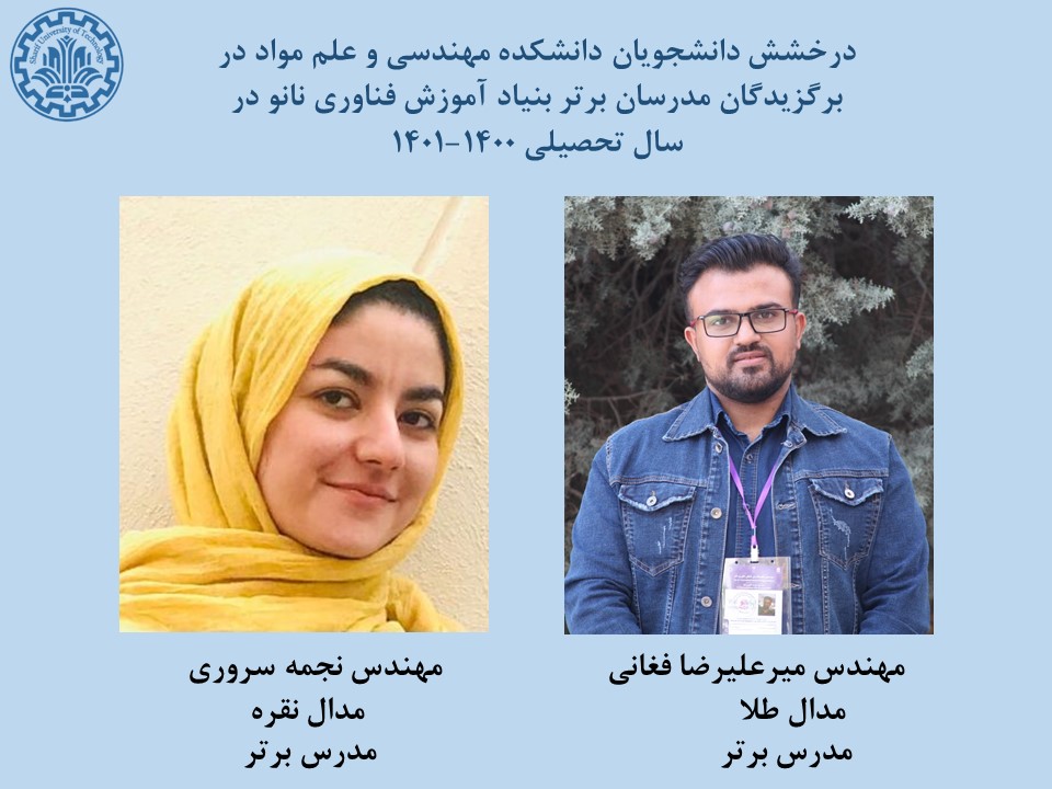 همچنین دو دانشجوی دانشکده به عنوان مدرسین برتر سال 1400-1401 بنیاد آموزشی فناوری نانو انتخاب شدند: